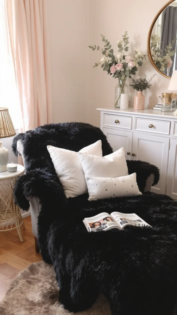 Hello, drama! This is how you do a cozy, high-contrast look. The stunning, plush black faux fur throw over the armchair makes it look like the most luxurious place to curl up. Soft pink curtains and the white cabinet lighten the mood, while a gold-rimmed mirror and fresh flowers add a delicate, feminine touch.