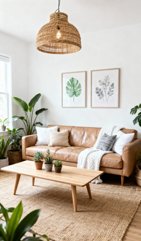This space perfectly blends a warm, inviting tan leather sofa with tons of life-giving houseplants to create a true sunny sanctuary. The wicker pendant light and textured rug really nail that boho-natural vibe. It’s a gorgeous look that feels both elevated and totally relaxed—imagine settling in here with a good book!