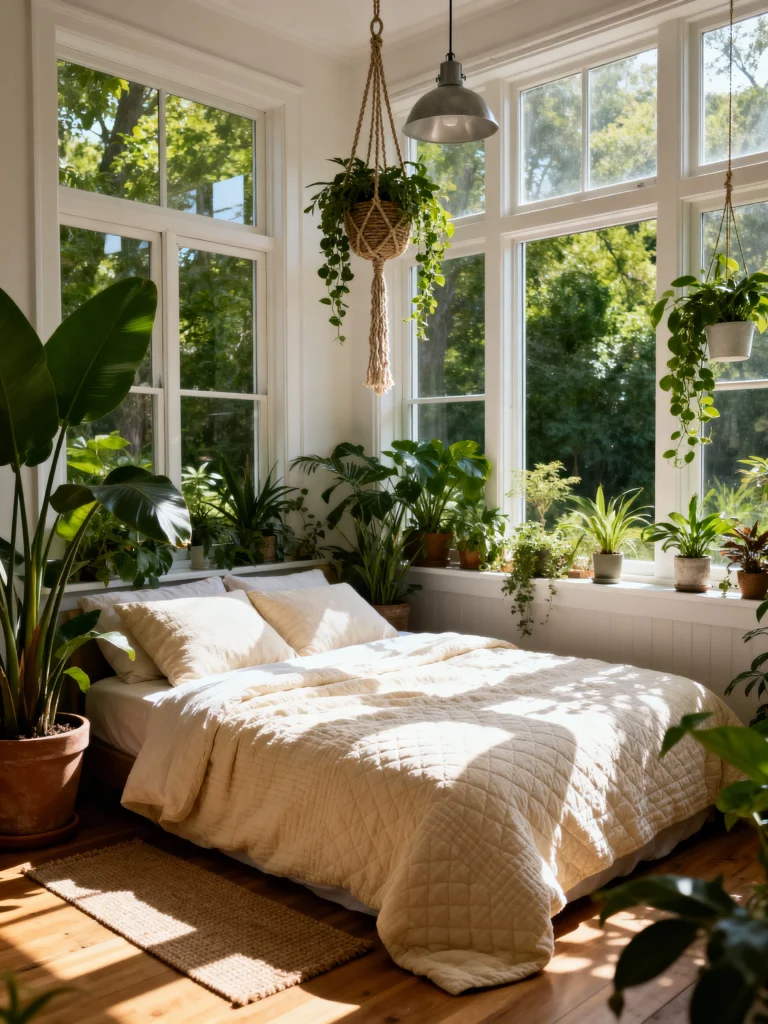 Wow, can you even imagine waking up here? This room is an absolute dream, flooded with that gorgeous morning light. The key to this look is the huge, beautiful windows that practically dissolve the wall between indoors and out. The bed, dressed in soft, creamy whites and neutrals, keeps the space feeling airy and calm. But the real star? The sheer volume of vibrant green plants! They line the windowsill and hang from the ceiling, turning the corner into a mini-greenhouse. If you have great natural light, take a cue from this and go all out with your plant babies—it instantly brings life and tranquility to the space. And seriously, that quilt looks so cozy!