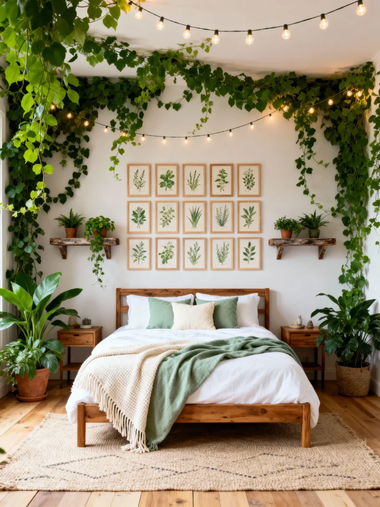 This is proof that you don’t need huge windows to create a lush, nature-filled space! The way the vines drape along the wall and over the headboard creates this magical, whimsical canopy effect—it’s like sleeping in a secret garden. The twinkle lights mixed into the greenery add that perfect touch of cozy romance, too. I also love the clever wall gallery featuring simple botanical prints; it reinforces the theme without being overwhelming. Paired with a simple wooden bed frame, natural fiber rug, and soft green accents, this room strikes a beautiful balance between rustic and romantic. This room is a perfect project for anyone who loves a good DIY.
