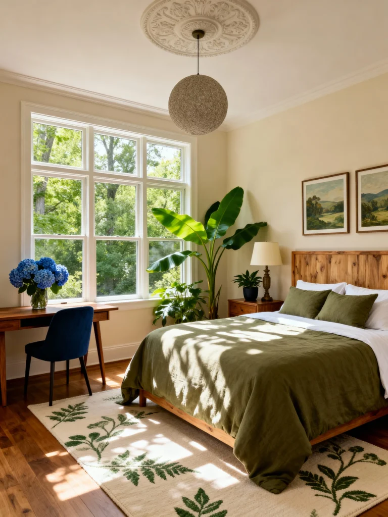 This room shows you how to incorporate the green theme in a slightly more refined, traditional setting. The olive-green duvet is the anchor, adding a deep, calming color without having a forest of plants. Of course, a large banana plant brings that unmistakable tropical feel and great height. Notice how they’ve paired the green with warm wooden tones in the desk and bed frame—it makes the whole space feel so grounding and rich. The floral-and-leaf rug is a super chic way to add pattern and theme without getting too busy. It’s a great example of a sophisticated botanical theme that’s perfect for a grown-up, serene retreat.