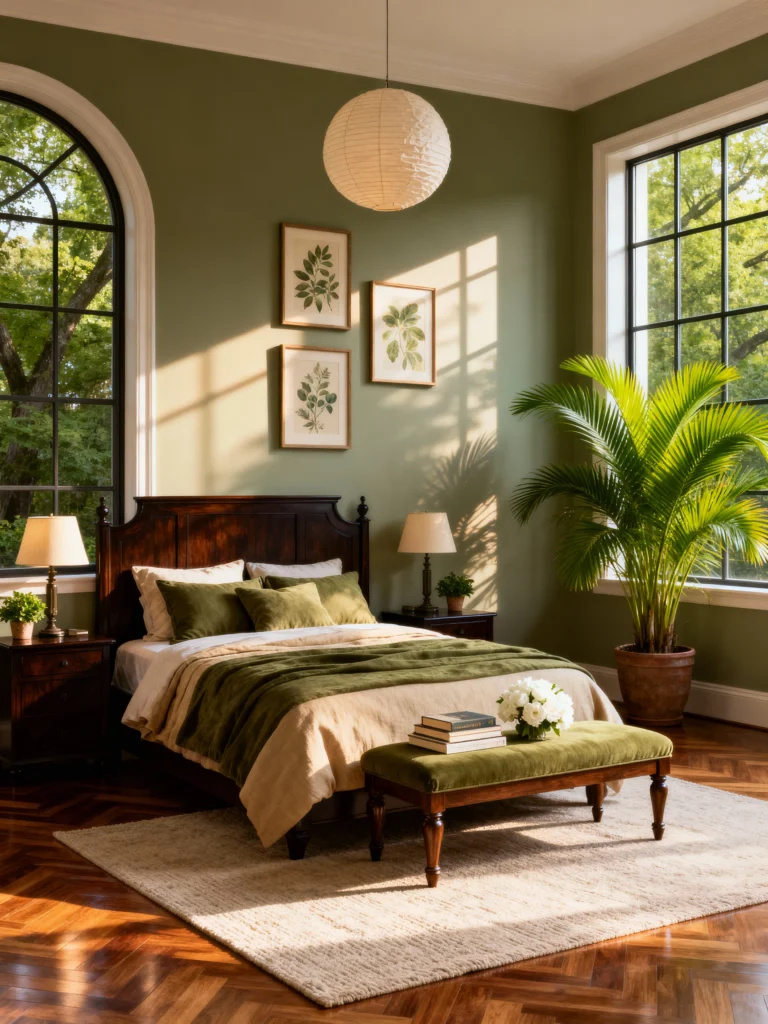 This room is the epitome of sophisticated comfort. The arched window is architecturally stunning, but the cohesive color palette is what really sells it. The walls are a beautiful, muted olive green that pairs perfectly with the dark wood furniture. The bedding, a mix of tan and olive shades, feels rich and inviting. A lovely potted palm adds that necessary tropical height and texture. I love the addition of the olive velvet bench at the foot of the bed—it’s a luxurious touch. The framed botanical prints above the bed reinforce the theme with a classic, artistic touch.
