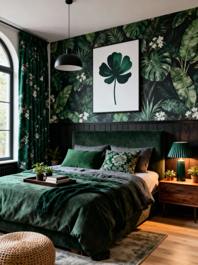 This bedroom shows how to make a classic, cozy statement with green. The walls are painted in a deep, warm moss-green, creating an inviting, enveloping mood—especially with the soft lamplight. Unlike some of the other rooms, the greenery is used more selectively here: a beautiful printed bed runner and a single tropical-patterned pillow. The rich, dark wood of the furniture and the velvet green curtain add to the luxurious, traditional feel. It’s an elegant, less-is-more approach to the botanical trend, focusing on deep, rich colors and textures.