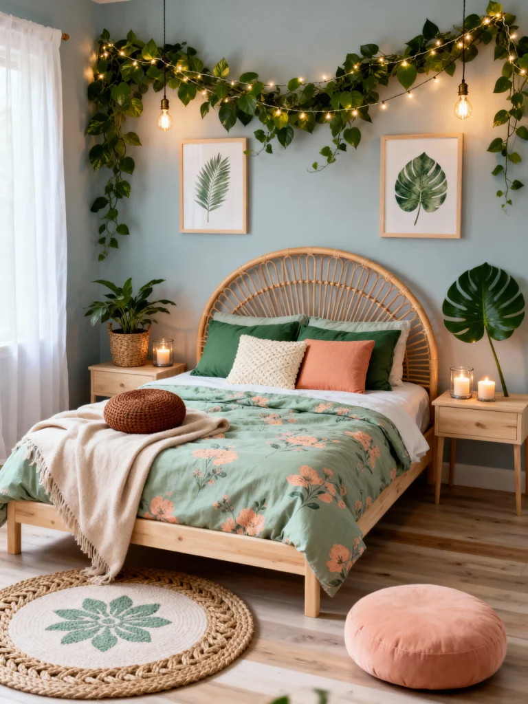 How sweet and cheerful is this room ? It takes the green sanctuary idea and gives it a light, slightly feminine twist. The soft aqua-blue walls are so refreshing, and the rattan headboard adds that lovely, relaxed texture. The bedding is a beautiful sage-green floral print, which is a great alternative to solid green. Once again, the draped string lights and ivy above the bed create a charming, enchanting feel. The small touches, like the round woven rug and the soft coral throw pillows, tie the whole look together. It’s a perfect blend of cozy, bohemian, and botanical.