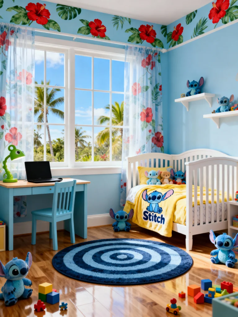 If you want your little one to wake up feeling like they’re on a permanent vacation, this is the look! This room is a total tribute to Lilo & Stitch, and honestly, that sky-blue wall is so calming. I love how the bold hibiscus flowers along the ceiling line bring in that “aloha” spirit without needing a full mural. The little desk area is a genius touch for a room that grows with your child, and the Stitch plushies everywhere add that playful, chaotic energy we love about the character. It’s bright, sunny, and perfectly beachy.