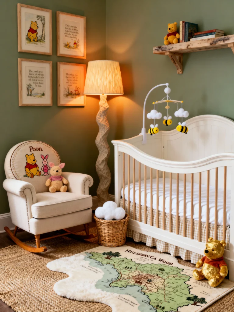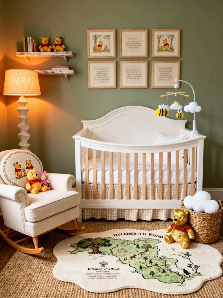 Now, this is for the parents who love a bit of a “mood.” We’re still in the Hundred Acre Wood, but this version feels much more vintage and grounded. Those sage green walls are stunning and make the cream-colored furniture really pop. My favorite part? That incredible Hundred Acre Wood map rug! It invites so much imagination. The lighting is soft and warm, making it the perfect spot for late-night lullabies and reading the original A.A. Milne classics.