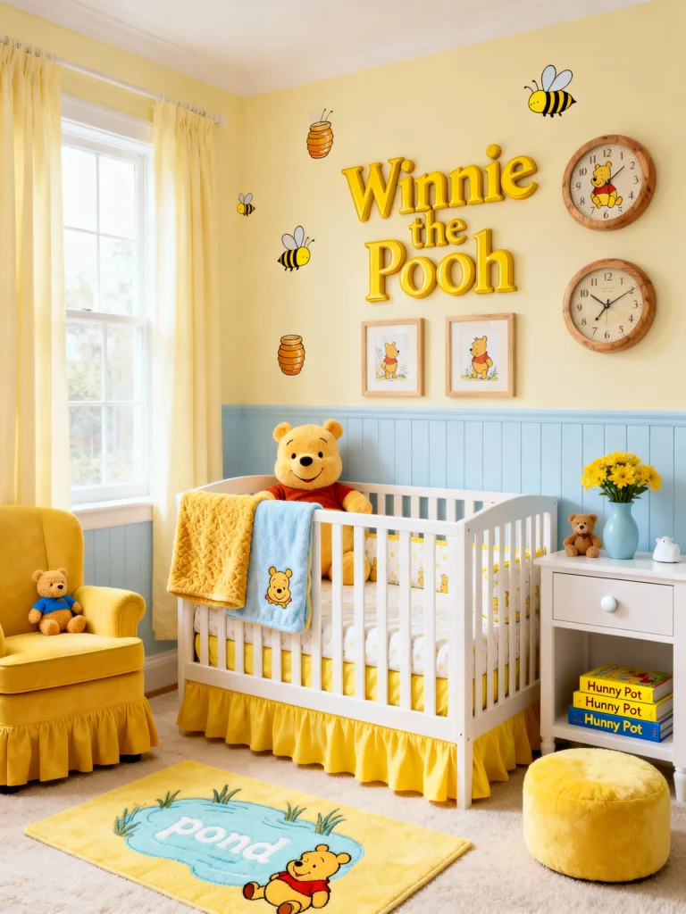 This nursery is like a warm hug. It uses a very traditional Winnie the Pooh palette—lots of sunny yellows and soft blues. The “Winnie the Pooh” 3D lettering on the wall is such a focal point! What really stands out to me is the “Pond” rug and the “Hunny Pot” books stacked by the crib. It feels organized but incredibly cozy. If you’re looking for a gender-neutral theme that feels timeless, this sunny yellow vibe is definitely the way to go.