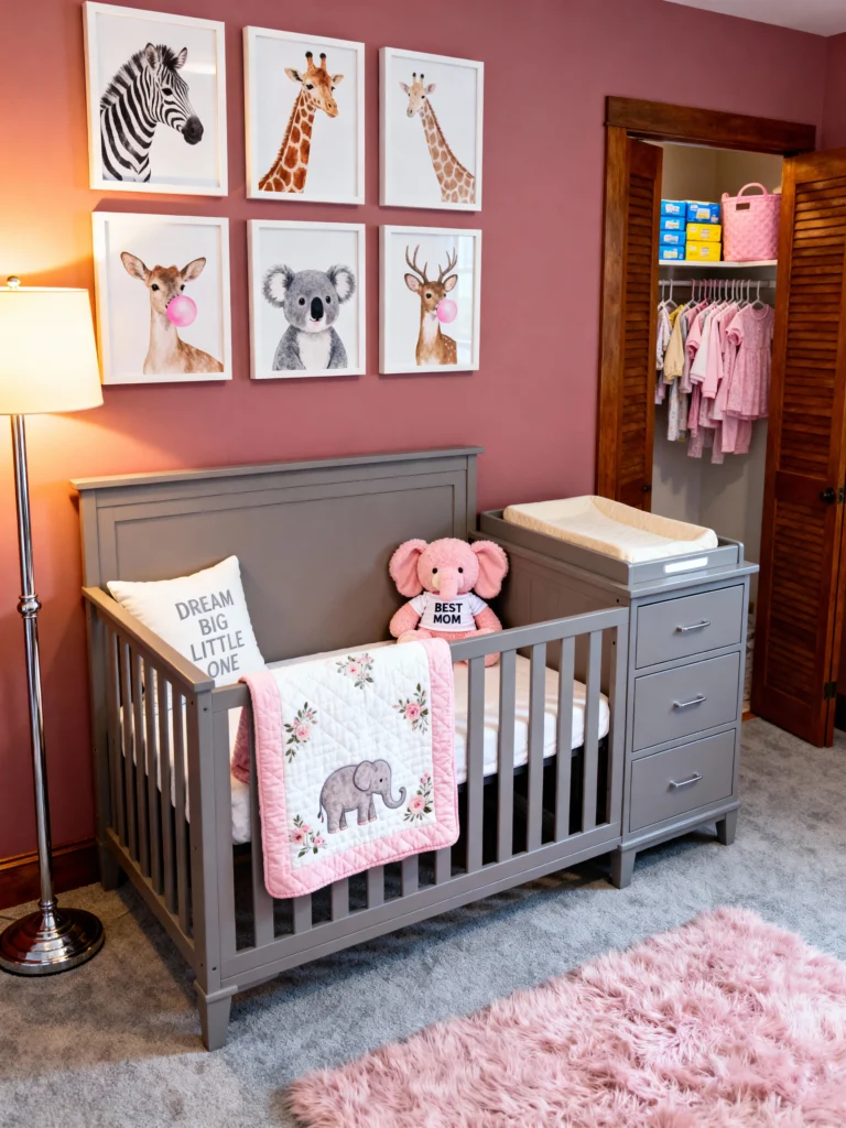 This room proves that “safari” doesn’t always have to be green and tan. By using a gorgeous dusty rose/mauve on the walls, this nursery feels sophisticated and sweet. The framed animal portraits—like the giraffe and the koala—are modern and clean. I also have to mention that grey crib with the attached changing table; it’s such a space-saver! The pink shag rug looks so soft, it’s basically begging for some tummy time.