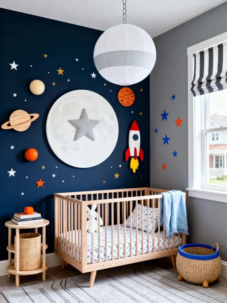 For the future astronaut! This space-themed room is so cool. I love the navy blue accent wall because it creates a high-contrast backdrop for the planets and that awesome rocket ship. The grey and white striped window shade adds a bit of a “preppy” touch to the cosmic vibe. It’s clean, organized, and uses natural wood tones to keep the room feeling warm and grounded despite being “in space.”