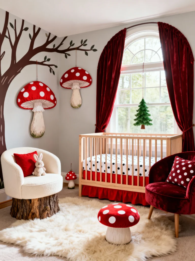 I am obsessed with the “Whimsigoth” vibes here! The giant mushroom wall hangings and the tree mural are so unique. The deep red velvet curtains give the room a theater-like, cozy feel, and the stool shaped like a stump is just the icing on the cake. It feels like a secret garden hidden away inside a house. It’s bold, it’s red, and it is full of personality.