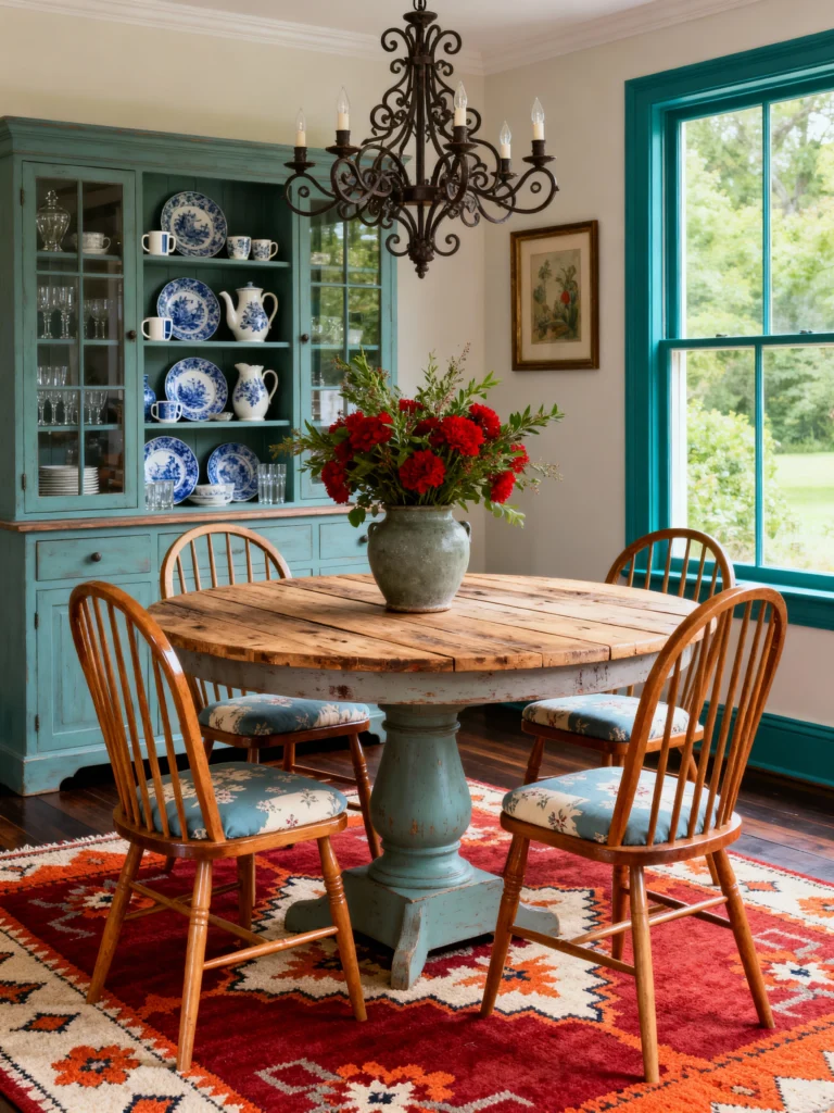 I am absolutely obsessed with the color play in this room! That teal hutch is a total showstopper—it’s such a clever way to display your favorite blue-and-white china without it feeling “stuffy.” The rustic, pedestal-style round table makes everything feel so approachable and communal.