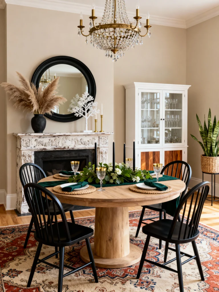 I love the contrast of the black Windsor-style chairs against the light wood. It’s a bit of “modern farmhouse” mixed with classic elegance. The white hutch and the ornate fireplace mantel keep the room feeling light and fresh. It’s the kind of room that feels great in the morning sun or under the glow of that gorgeous chandelier at night.