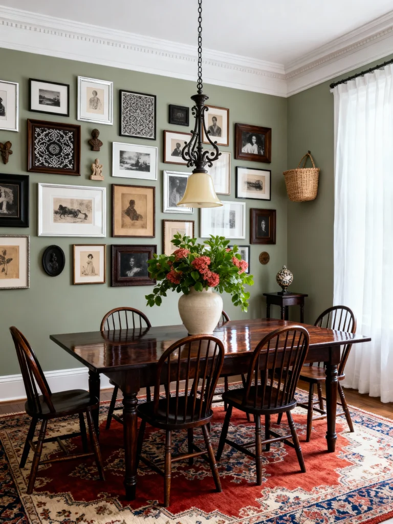 If you have a collection of art gathering dust, this is your sign to create a gallery wall! I love how this sage green backdrop makes all those mismatched frames feel like a cohesive collection. It’s such a smart way to add personality and history to a dining space.