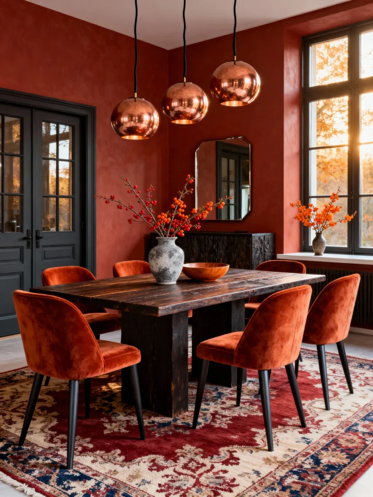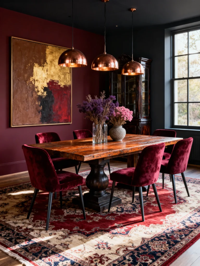 Those copper domes are back again, and they look stunning reflected against the dark walls. The rug pulls in those reds and creams to ground the whole look. It’s a very intimate, high-fashion space. If you want your dining room to feel like a hidden, upscale lounge, this is exactly how you do it.
