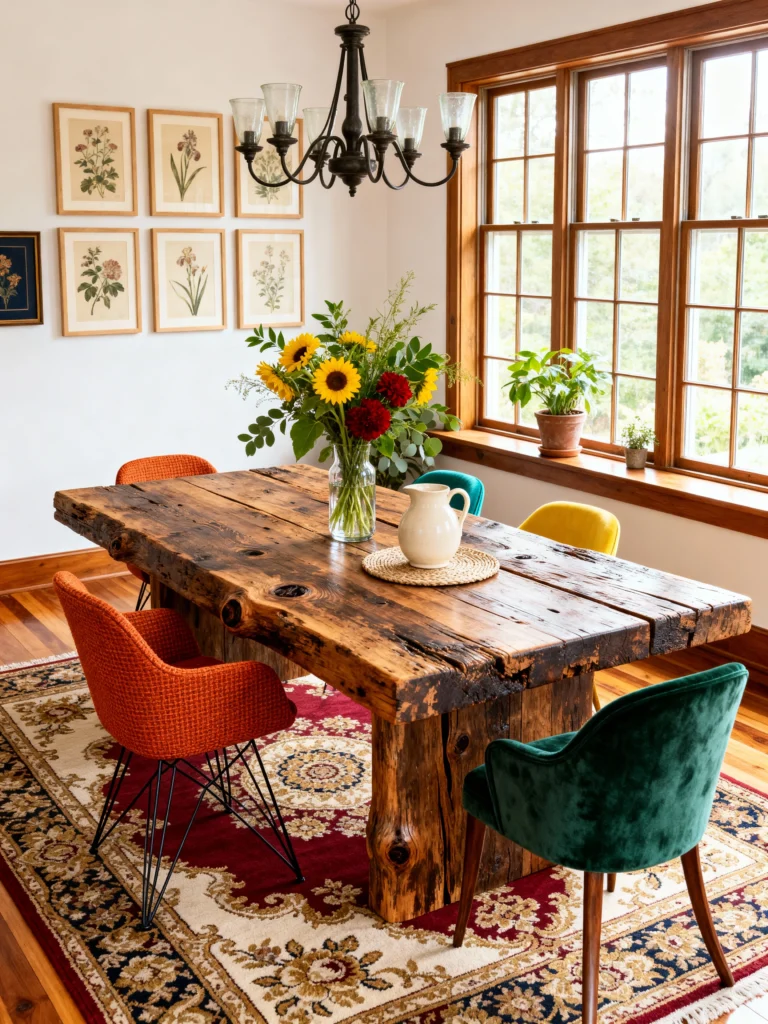 This might be the ultimate “happy” dining room. That live-edge wooden table is a literal work of art—the knots and imperfections are what make it so special. But instead of going full-on rustic, they’ve paired it with these amazing mid-century chairs in forest green, mustard, and orange.