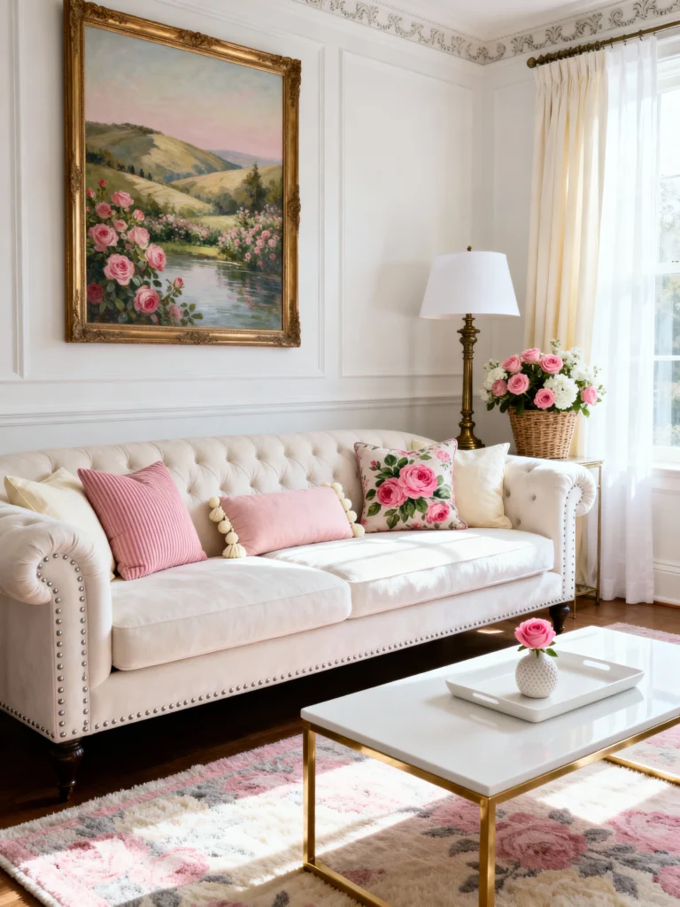 Can we just talk about this sofa for a second? That cream-colored tufted velvet is the ultimate base for those pops of pink. I love how the large landscape painting pulls the whole room together—it’s like bringing a view of a rolling meadow right into the living room. It’s elegant but doesn’t feel “stiff,” thanks to the mismatched pillows and that super soft floral rug. It’s the perfect spot for a Sunday afternoon nap.