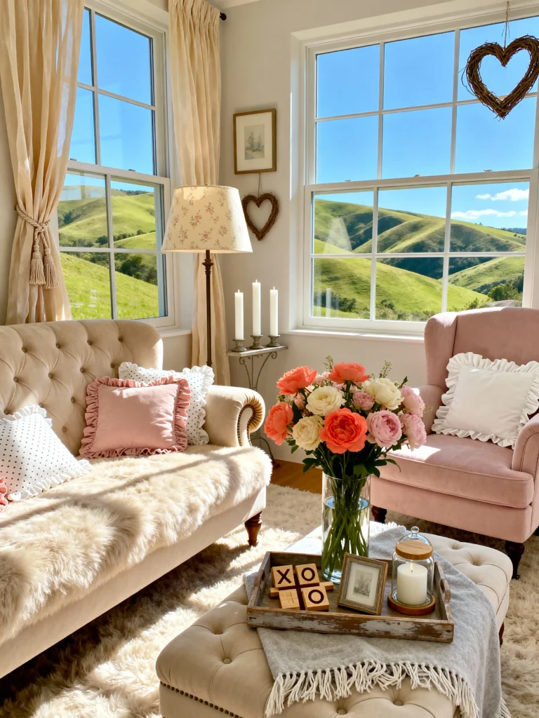 Finally, look at this view! The interior is gorgeous—love the sheepskin rug and the “XOXO” blocks—but those windows are the real star. Framing the bright green rolling hills like a painting is such a genius move. The soft pink armchair and the floral lamp create a cozy “inside” world that perfectly complements the vibrant “outside” world. It’s pure sunshine in room form.