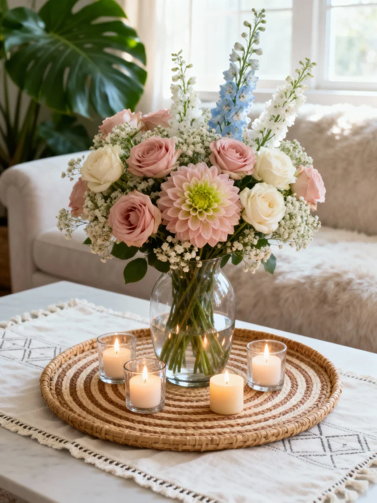 Sometimes the smallest details make the biggest impact. I’m obsessed with this simple setup: a woven tray, a few flickering candles, and a massive bouquet of dahlias and delphiniums. It’s so calming! The blue accents in the flowers really break up the warm tones of the room. It just goes to show you don’t need a total remodel to refresh a space—just some fresh blooms and good lighting.