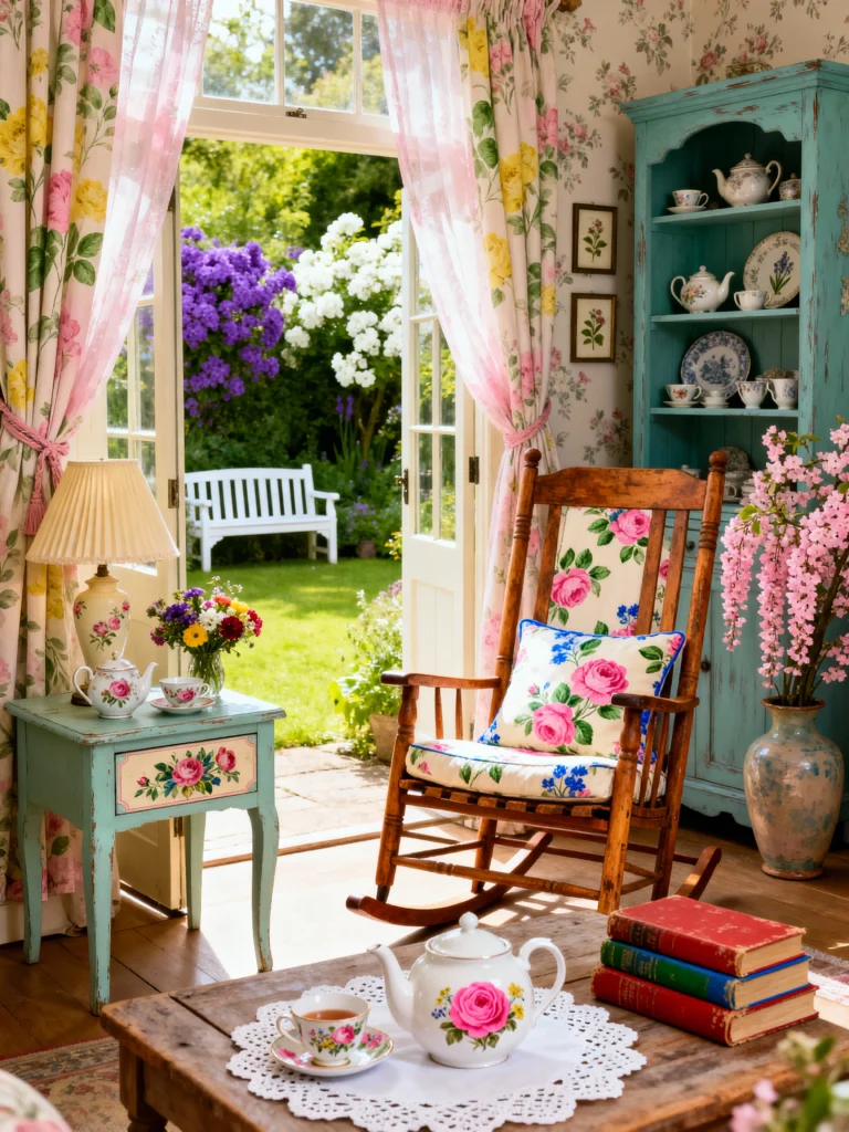 This might be my favorite view of all. Those floor-to-ceiling floral curtains framing the open doors to the garden? Total magic. I love the “lived-in” feel here—the teal hutch filled with mismatched teapots and the rocking chair ready for a good book. It feels like a secret cottage tucked away in the countryside. It’s colorful, whimsical, and perfectly imperfect.