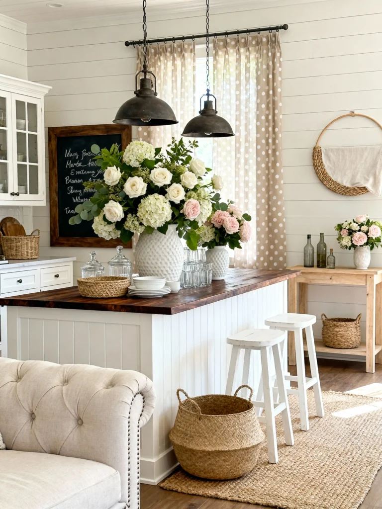 Kitchen islands are usually so functional, but this one feels like a work of art. The white shiplap walls and dark wood countertops give it that classic farmhouse base, but the massive vases of white hydrangeas and roses soften everything up. And those wicker baskets underneath? Perfect for hiding the clutter while keeping that organic, earthy texture. It’s bright, airy, and so inviting.