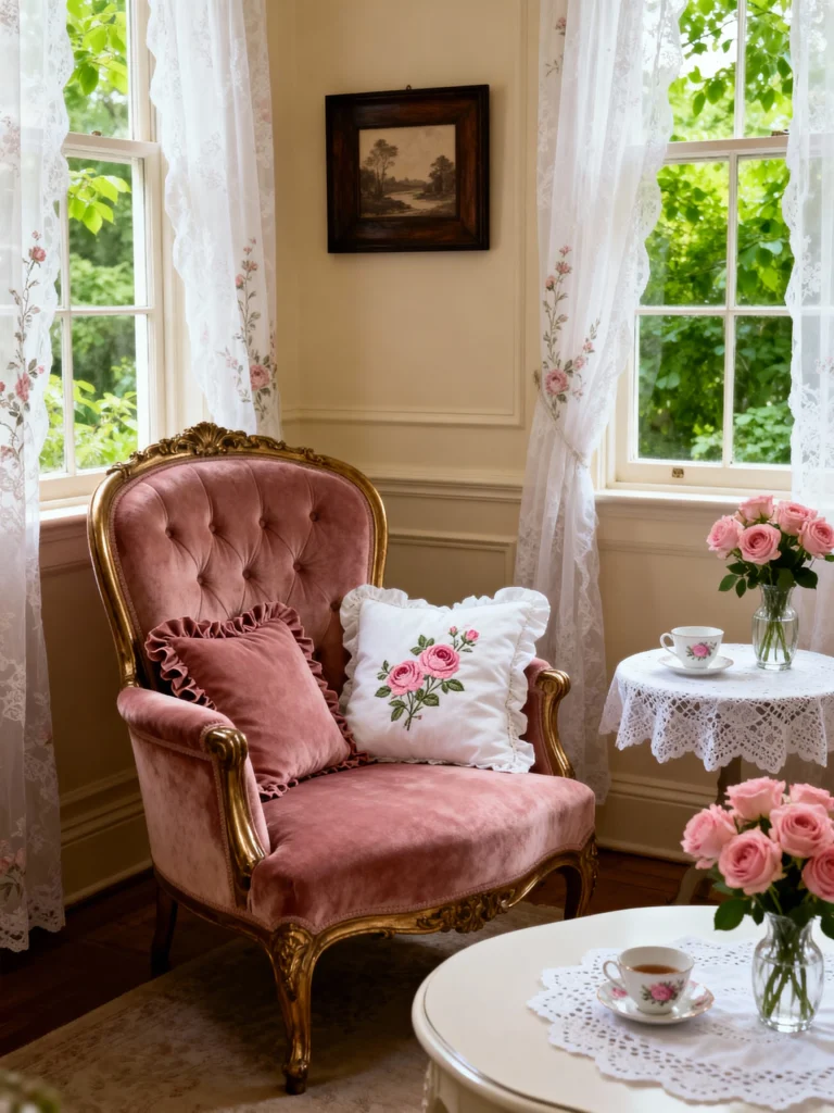 Every house needs a “me-time” corner, and this is definitely it. That dusty rose velvet armchair with the gold trim feels a little bit royal, doesn’t it? Pairing it with lace curtains and a dainty little tea table makes the whole nook feel incredibly romantic. It’s the kind of spot where you’d sit to write a handwritten letter or just daydream while looking out at the trees.