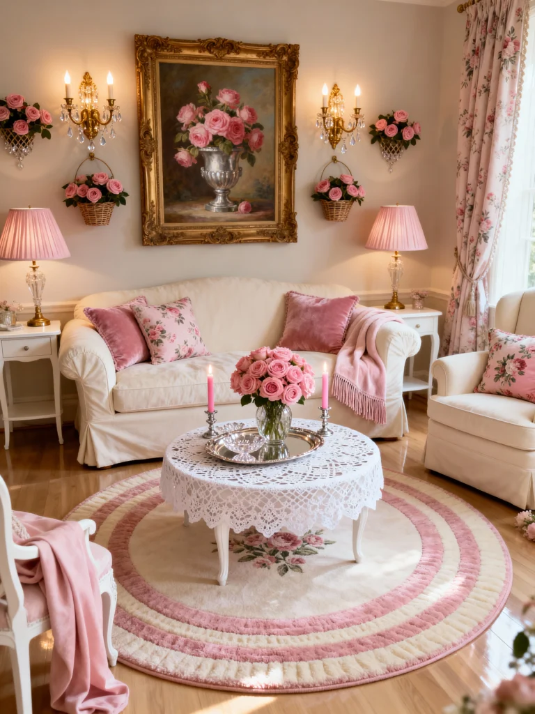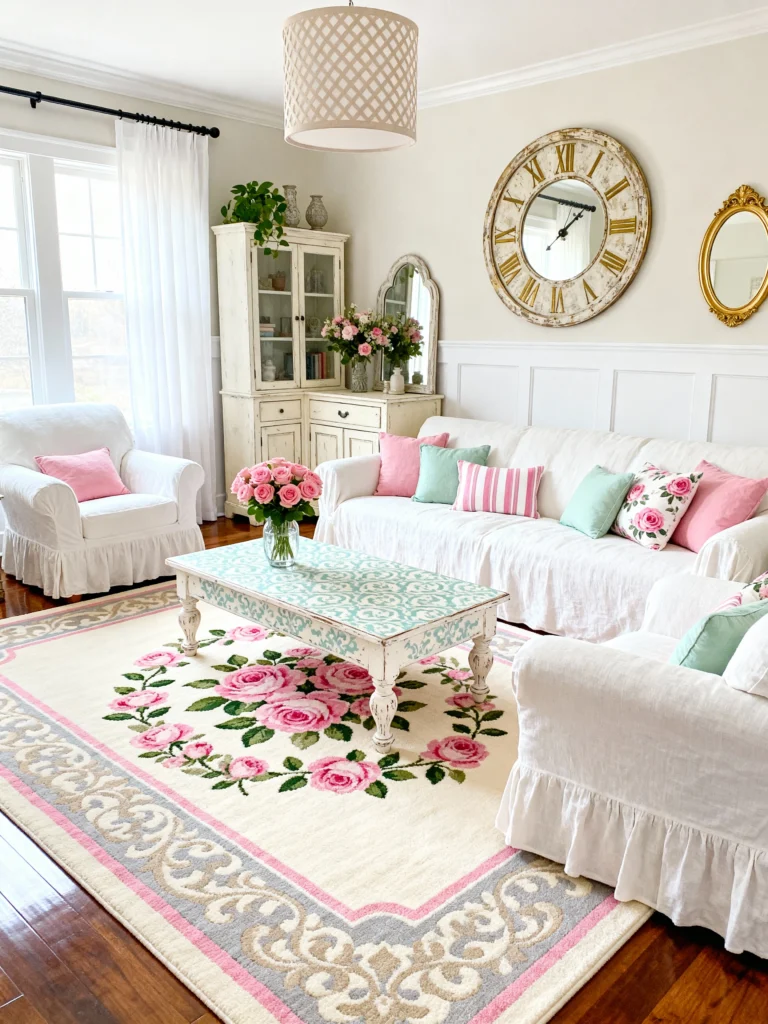 This room is a masterclass in using white to make a space feel huge and then using pink to make it feel warm. That rose-patterned rug is such a statement piece! It ties in perfectly with the throw pillows and the fresh bouquet on the coffee table. I also love the oversized clock and the distressed white cabinet in the corner—it adds that “shabby chic” character that keeps the room from looking too modern.