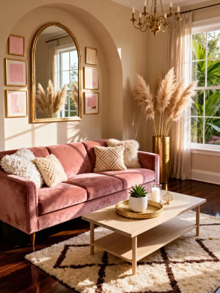 This room has a slightly different vibe—more “boho chic” than “cottagecore,” but it still fits the dream! The mauve velvet sofa is stunning against those warm, sandy-colored walls. Instead of fresh flowers, we’ve got tall pampas grass which adds so much height and drama. The archway with the gold-rimmed mirror makes the whole room feel architectural and high-end. It’s cozy, trendy, and so sophisticated.