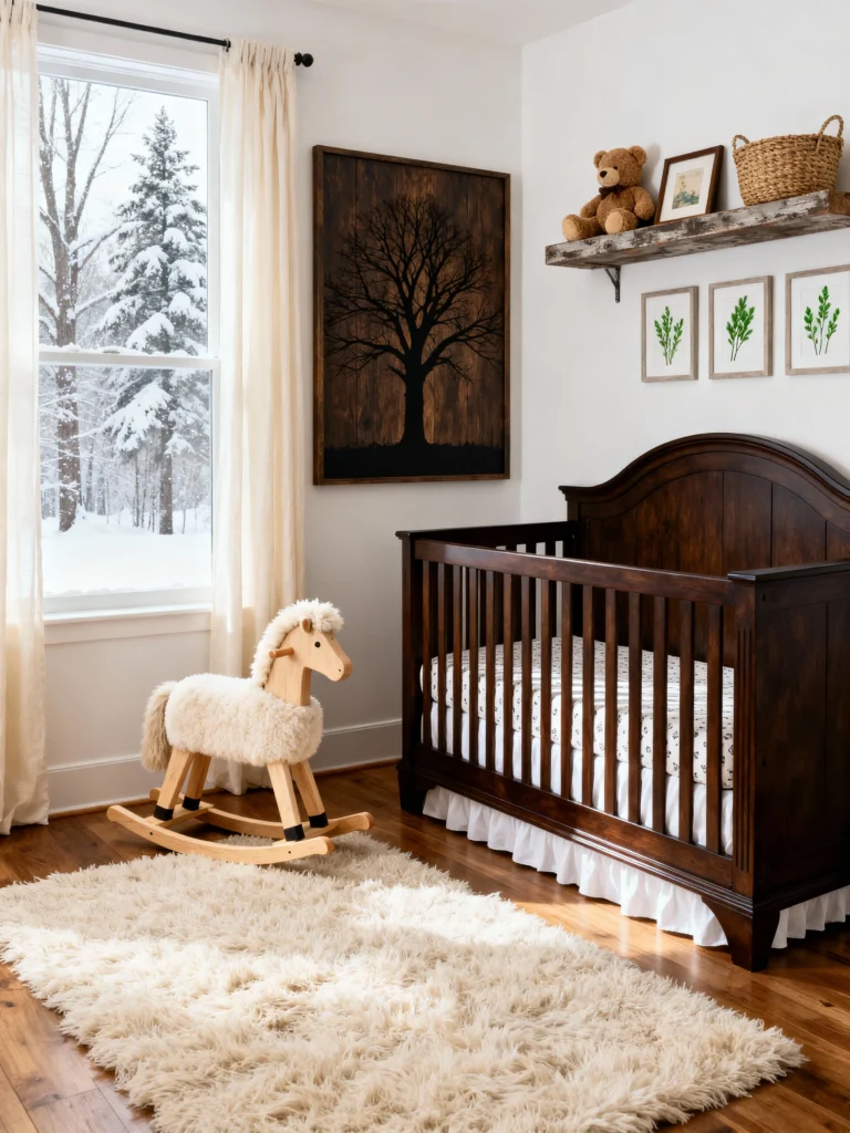 There is something so luxurious about dark wood. This crib is a total statement piece—it feels sturdy and classic. When you pair that deep chocolate wood with bright white walls and a snowy view outside the window, it feels incredibly high-end. That rustic “tree” art on the wood planks is such a cool alternative to a standard framed print. And can we please talk about the sheepskin rocking horse? It’s the ultimate “cool kid” toy that doubles as decor.