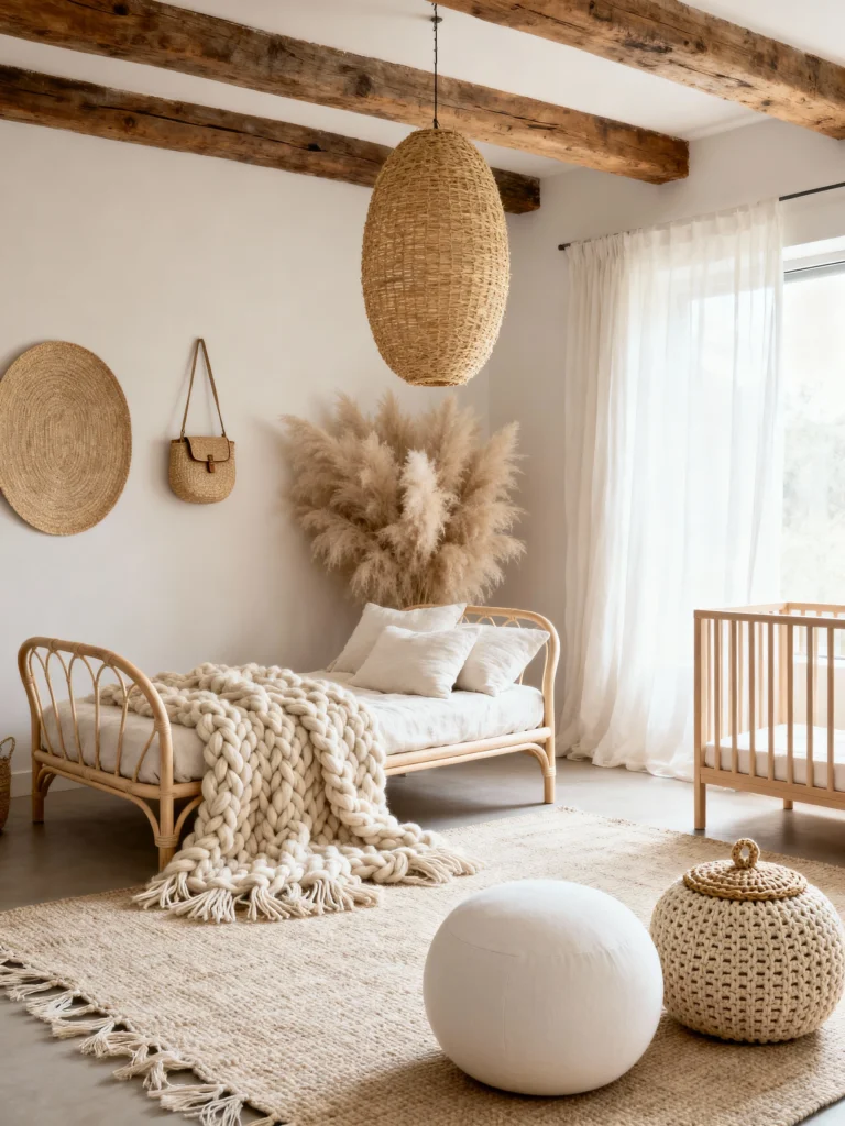 This is straight out of a design magazine! Those exposed wooden ceiling beams are a dream, but even if you don’t have those, you can steal this style. It’s all about texture: the rattan daybed, the massive pampas grass arrangement, and that gorgeous chunky knit blanket. It feels very “global traveler” meets “zen retreat.” The use of a hanging bag as wall decor is such a clever, stylish touch. It’s a nursery that definitely doesn’t feel “babyish,” which means it’ll age beautifully.