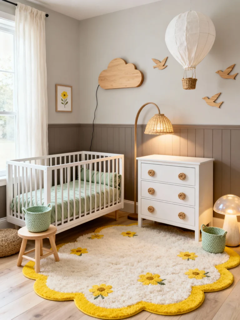 Finally, we have this absolute ray of sunshine! That sunflower-shaped rug is everything—it’s so playful and unique. The hot air balloon hanging from the ceiling and the cloud light on the wall make the whole room feel like a walk through a meadow. I love the “mushroom” lamp on the floor, too. It’s a very imaginative space that’s bound to spark some great bedtime stories. It’s proof that you can have a “theme” that still feels chic and curated.
