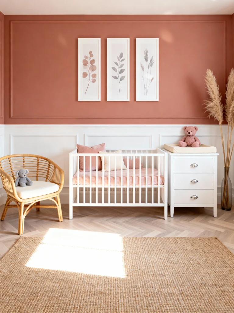 I am obsessed with this color palette! That earthy, terracotta-clay color on the top half of the wall is so trendy right now. Pairing it with the white wainscoting on the bottom keeps the room feeling bright and open. The three botanical prints are a simple way to fill wall space with something elegant. The wicker chair in the corner adds a nice natural element that complements the jute rug. It’s a very “grown-up” nursery that still feels soft and welcoming.