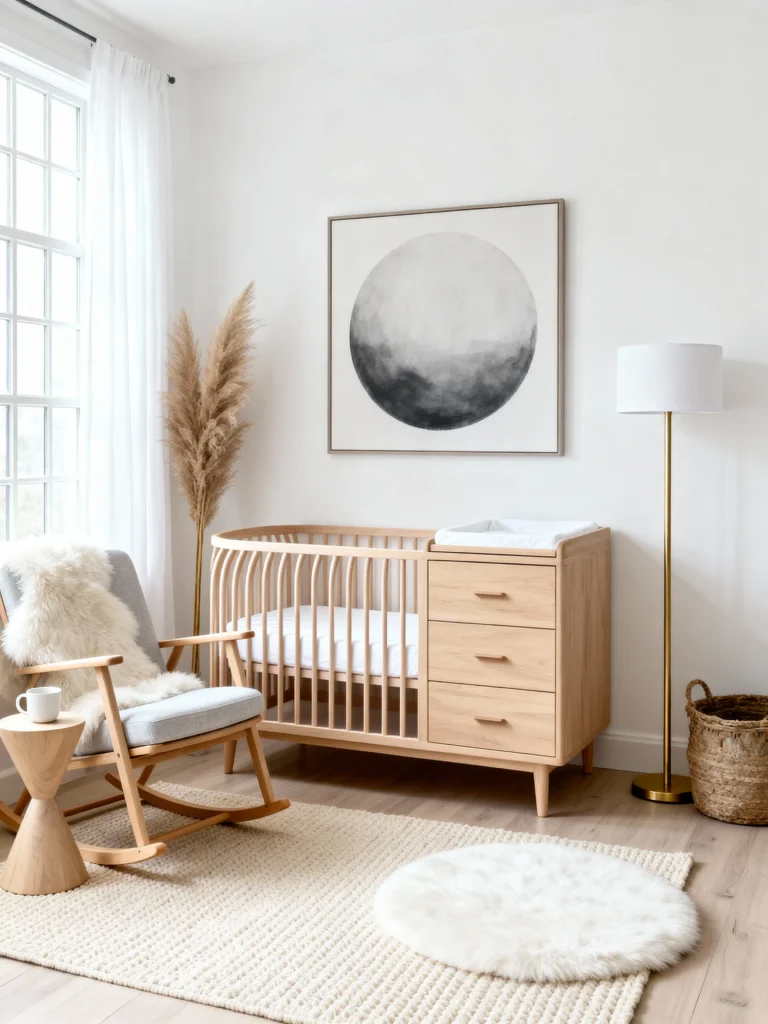 This one is for my minimalist lovers. It’s so clean and serene! The light, natural wood of the crib-and-dresser combo is very “Scandi-cool.” That circular moon art is such a vibe—it’s artistic but still feels appropriate for a baby’s room. Also, notice the pampas grass in the corner; it adds height and texture without needing a bunch of bright colors. If you want a space that feels like a quiet sanctuary (especially during those 2 AM feedings), this minimalist approach is the way to go.
