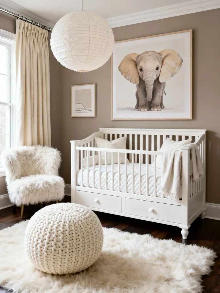If you’re a fan of the “classic with a twist” look, you’ll love this. That giant elephant portrait is just pure joy! What I really appreciate here is the functionality—notice the drawers built right into the bottom of the crib? Total lifesaver for extra sheets. The chunky knit pouf and the fluffy white rug make the dark wood floors feel so much softer. It’s a great example of how you can use a neutral taupe on the walls to make white furniture really “pop” while keeping the room feeling calm.