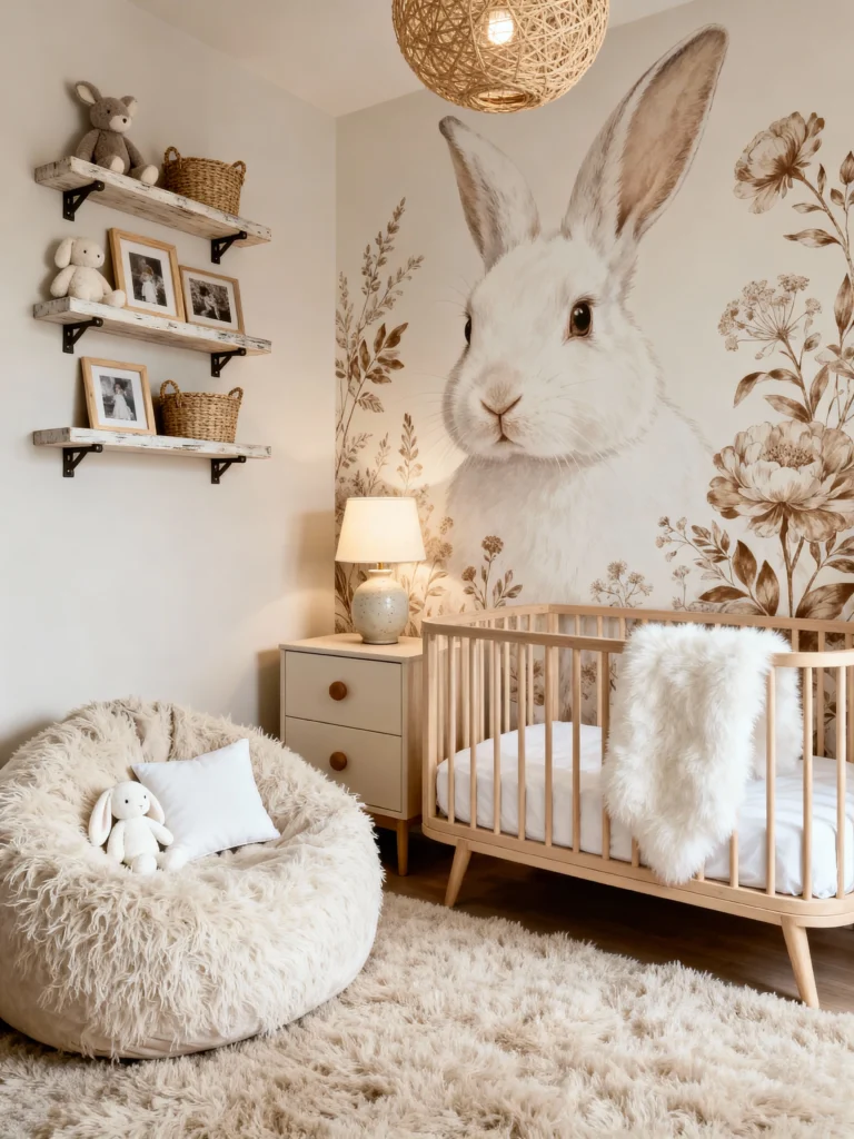 Can we just talk about this mural for a second? If you want a room that feels like a warm hug, this is it. The oversized, soft watercolor bunny is such a showstopper without being overwhelming because of those muted, earthy tones. I love how they paired it with that super-shaggy bean bag—it looks like the perfect spot for toddler storytime later on. The rustic wooden shelves with the wrought iron brackets add just a touch of “farmhouse chic” to keep things grounded. It’s sweet, sophisticated, and totally timeless.