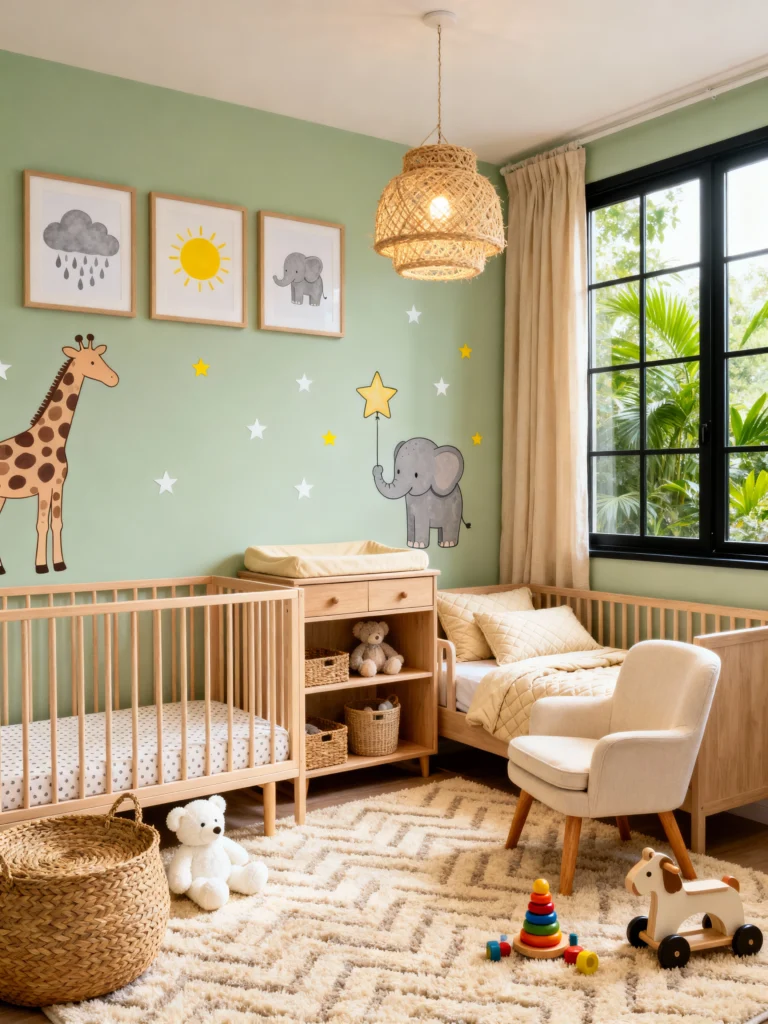 If you want a little color but don’t want to go “neon,” this sage green is perfection. It’s gender-neutral and so soothing. The animal decals—the giraffe and the elephant with the balloon—are such a playful touch that you can easily change as the baby grows. I also love that they’ve squeezed a toddler bed in here alongside the crib; it’s a great layout for siblings or just for a parent to crash on during a rough night! The woven pendant light really ties that “natural” theme together.