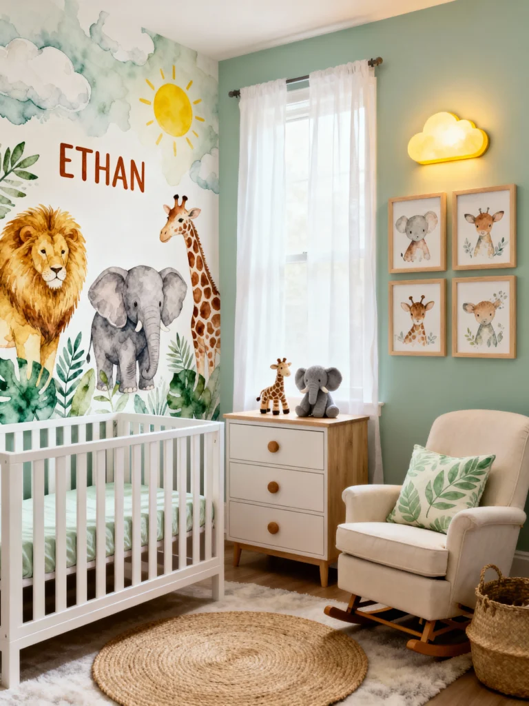 Does it get any cuter than a personalized mural? Having “Ethan” (or your little one’s name) right there on the wall with a lion and a giraffe is so special. This room is bright, cheerful, and full of personality. The minty green walls match the bedding perfectly, and the cloud-shaped wall light is such a whimsical touch. It’s a great example of how you can use a bold mural on one wall and keep the rest of the room simple so it doesn’t feel cluttered.