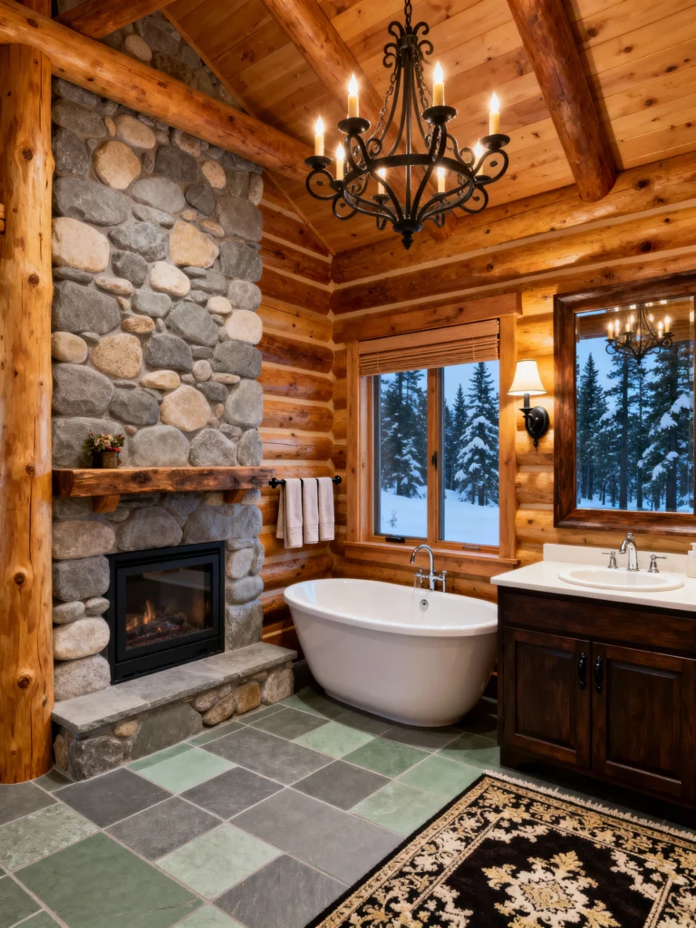 This bathroom is pure magic! The massive stone fireplace is the absolute centerpiece, instantly transforming the space into a cozy mountain retreat. I love how the log walls and exposed beams frame the whole scene, giving it that genuine cabin feel. The deep, standalone tub is perfectly positioned for gazing out at that gorgeous snowy view—I mean, talk about a winter wonderland! The dark wood vanity and the elegant, wrought-iron chandelier add just the right amount of rustic elegance to this perfect fireside sanctuary.