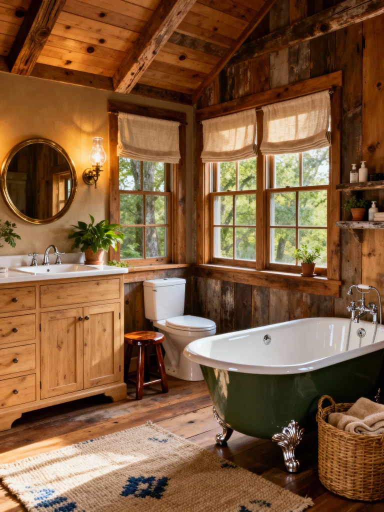 This is the kind of rustic that feels light, airy, and super cheerful! The abundance of windows brings the outdoors right in, and the natural light just makes the wood tones glow. That deep green clawfoot tub is such a fantastic, unexpected pop of color against the natural wood walls and floors—it gives off a charming, farmhouse-meets-forest vibe. Notice the sweet details, like the simple linen window shades, the vintage-style wall sconce, and the little wooden stool. It feels so grounded and comfortable, like the perfect place to start or end your day.