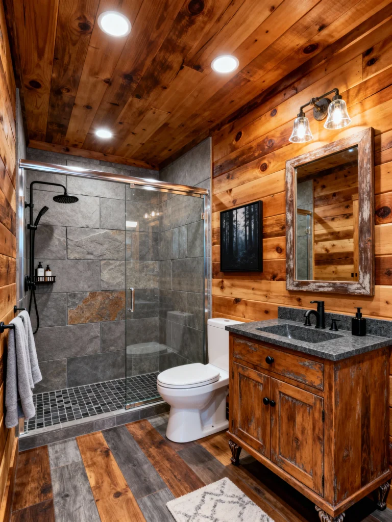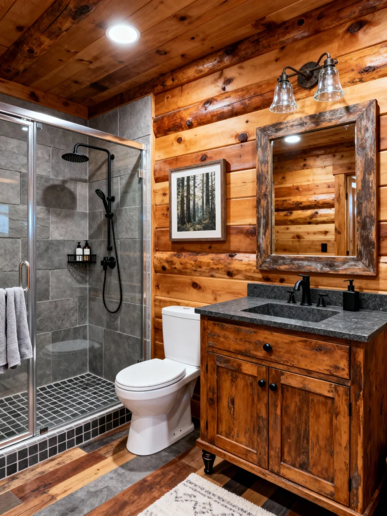 This is another great example of a rustic-meets-modern style. The horizontal wood log walls scream “cozy cabin,” but the dark gray, square slate-style shower tile and the glass enclosure feel completely contemporary. The black hardware and fixtures create a sharp, clean contrast against the warm wood and gray stone. The vanity is a beautiful piece of rustic furniture with a dark granite top. It’s a fantastic blueprint for someone who wants the warmth of wood without sacrificing a polished, updated look.