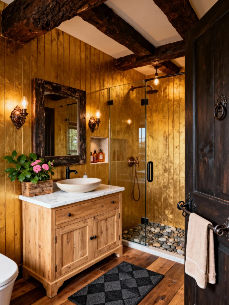 This bathroom is a statement! The textured gold wall finish is so dramatic and luxurious, it almost makes the rest of the room fade away. Paired with the heavy, dark wood door and the rugged ceiling beams, it gives off a unique, Old-World charm. I adore the natural wood vanity with the simple, contrasting white marble top and vessel sink. The shower is another winner, featuring clear glass and a natural river rock floor. It’s an unexpected mix of rustic materials and high-glamour finishes that just works.