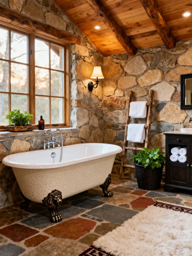 This space feels straight out of a storybook! The huge, uneven stone wall provides incredible texture and character. I love how the light pours in through the large window, illuminating the classic, creamy clawfoot tub. The floor tiles are fantastic, mixing different shades and shapes of slate for a colorful, natural look. The rustic ladder used as a towel rack is such a clever and easy DIY detail to copy, too! It’s just an inviting, natural, and utterly charming room.