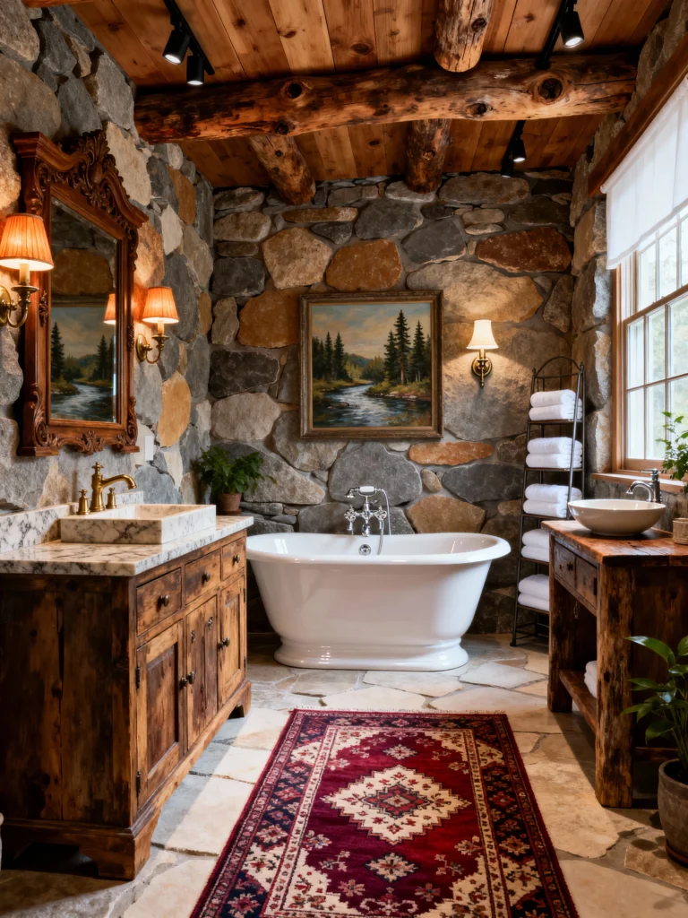 Talk about the full rustic experience! You’ve got the natural stone wall, exposed rough-hewn beams, and two distinct wooden vanities. It’s a beautifully layered space. The vanities are each unique—one with a marble top and a more traditional look, and the other a simple, rugged wood slab supporting a vessel sink. That beautiful white soaking tub is framed perfectly by the artwork above it, and the rich, patterned rug anchors the whole room with a touch of color and softness. It feels like a high-end spa in the middle of the wilderness.