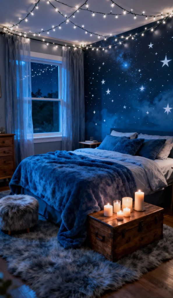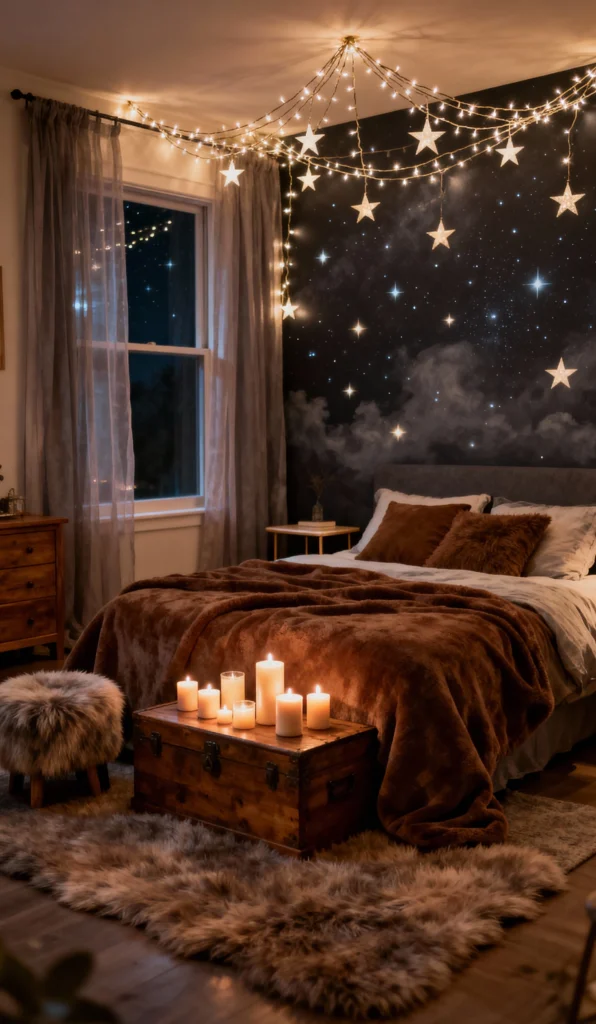 Hello, rustic luxury! This room just screams “stay in bed.” The deep brown and rust-colored textures—from the fluffy bedspread to the shaggy rug and pouf—make it feel unbelievably plush. The celestial wallpaper is amazing, and the star-shaped fairy lights strung across the ceiling beautifully tie into the nighttime theme. The wooden trunk acting as a coffee table is the perfect cozy, functional touch.