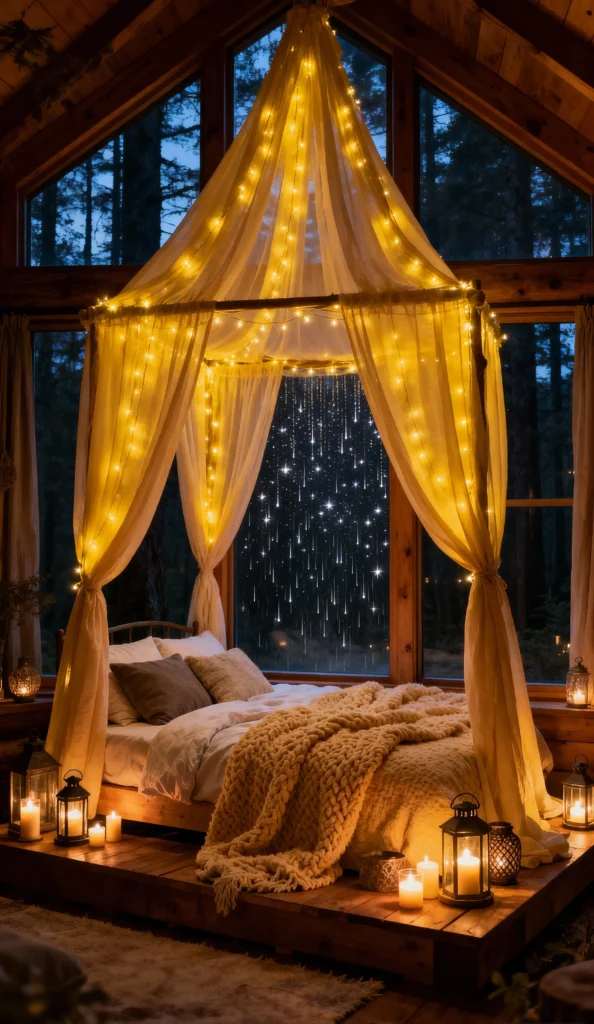 Wow, what a view! This bed is tucked into what looks like a dreamy, rustic cabin, framed by massive windows that bring the forest right to your bedside. The sheer, sunny yellow canopy and hanging fairy lights create a literal curtain of light and warmth. The thick, chunky knit throw and clustered lanterns make this space feel incredibly secure and cozy, even with all that stunning nature just beyond the glass.