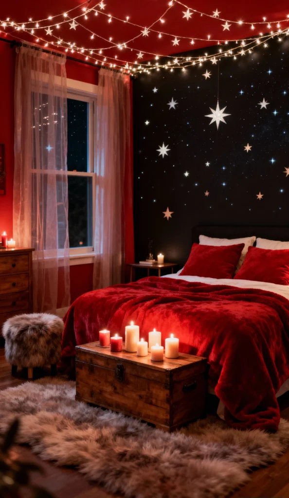 Talk about dramatic! This bedroom is a fiery, passionate escape. The deep red walls and rich velvet bedding are bold choices, softened by the delicate star-shaped fairy lights strung across the ceiling. The black feature wall with white stars makes the red pop. And of course, the oversized candles on the rustic trunk and the furry stool add that essential layer of cozy texture. It’s a perfect mix of glamour and warmth.