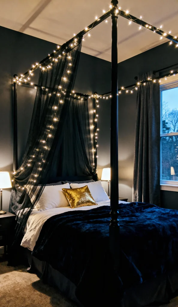 This room is pure sophistication and moody elegance! The black canopy and deep navy bedding create a dramatic backdrop, making the tiny warm fairy lights look like a galaxy of shimmering stars. The pop of a gold pillow is a stroke of genius—it adds a touch of glamour without losing the room’s intimate, dark aesthetic. This setup is perfect if you love a bedroom that feels like a chic, private den.