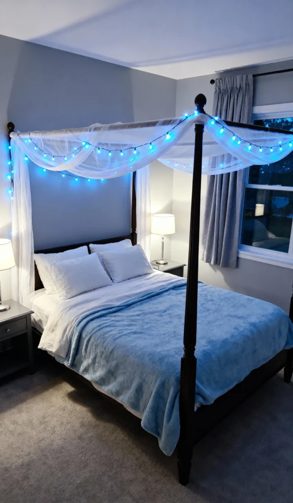 Obsessed with how cool and serene this space feels! While many cozy looks go for warm tones, this uses a refreshing blue and white palette to create a soothing twilight atmosphere. The subtle blue fairy lights are the perfect unexpected touch, casting a calming glow over the white canopy and soft blue throw. It’s a minimalist, modern take on the dreamy canopy bed, proving that soft lighting works just as well with cool colors.