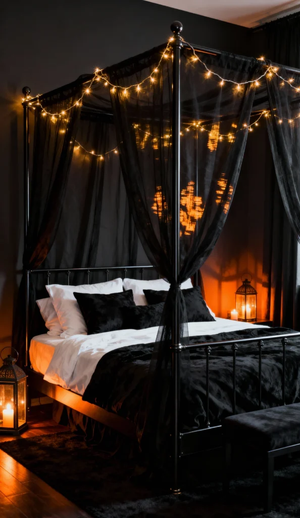 This is gothic elegance redefined! The all-black metal bed frame and sheer canopy create an incredible sense of intimacy and drama. The black duvet is perfectly balanced by the crisp white sheets and pillows, offering a great contrast. The magic happens with the light: the warm glow from the floor lanterns and the fairy lights casts a rich, inviting orange-amber light across the dark room. Simply stunning!