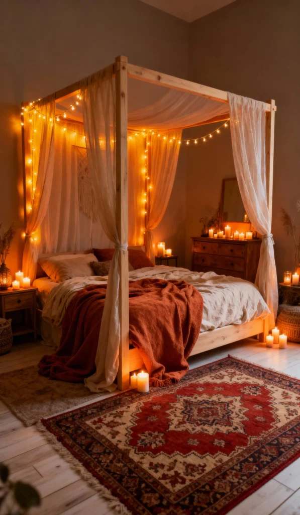 This is the ultimate cozy-chic setup! I mean, who wouldn’t want to wake up in a bed like this? The combination of the light wood four-poster, the sheer fabric, and those abundant warm fairy lights creates such a luxurious, soft glow. Notice how the thick, fluffy rug and the cluster of candles on the floor instantly dial up the romance. It feels like sleeping on a cloud. It’s proof that sometimes, the simplest, warmest textures make the biggest impact.