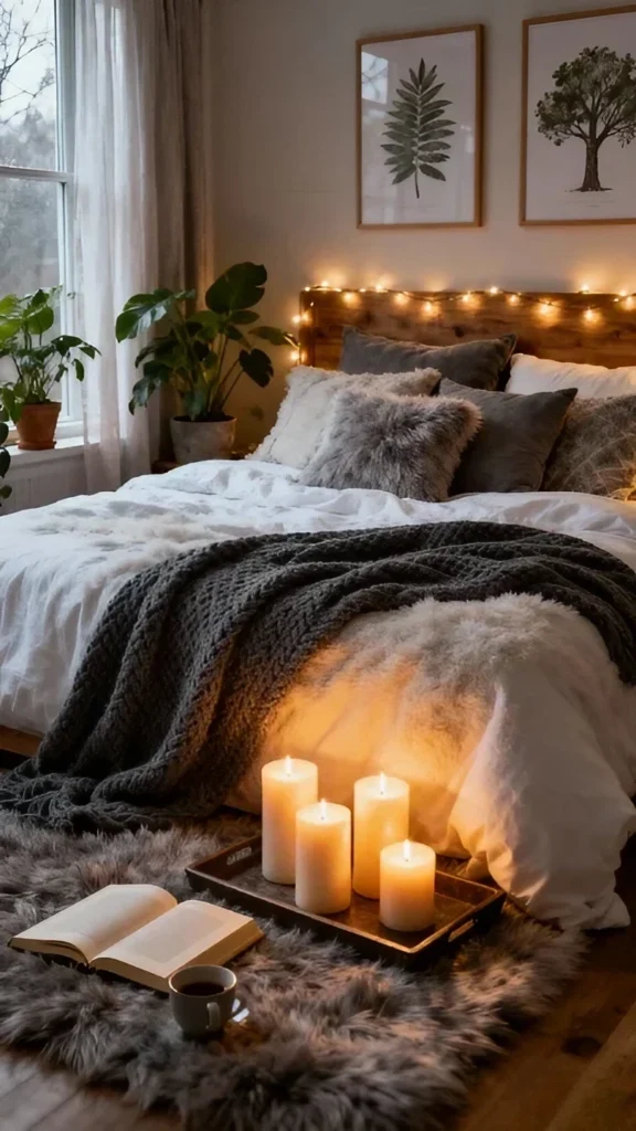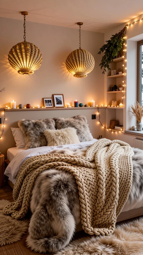 Oh my goodness, the texture! This room is like a giant, soft hug. The layers of faux fur, sheepskin rugs, and that chunky knit blanket scream luxury and warmth. The simple, light walls and natural pendant lights keep the focus right on the bed’s plush layers. A few candles and string lights add a soft, magical sparkle. It’s the perfect cozy setup for a chilly winter night—you might never want to leave this cloud!